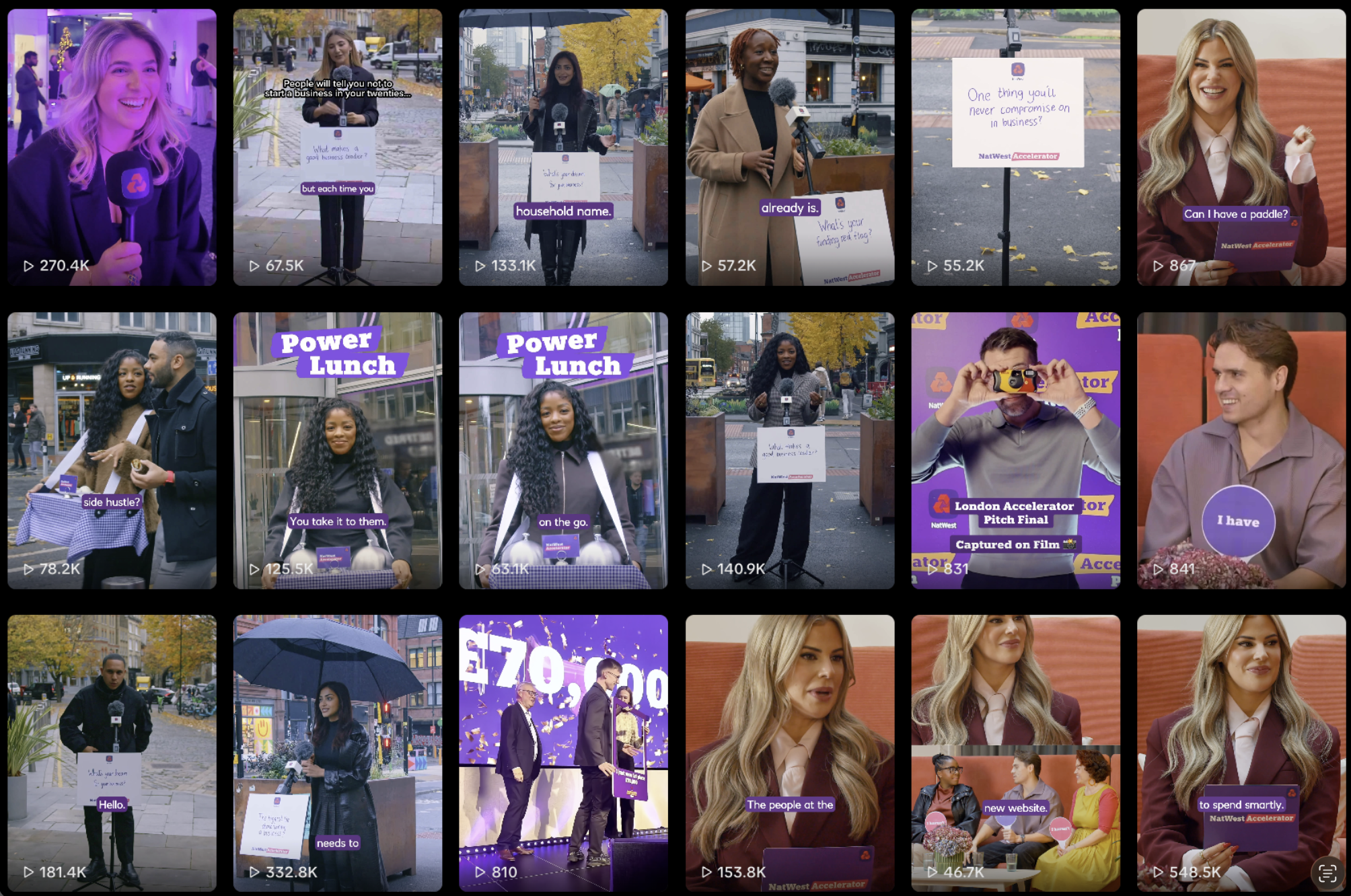 We created a suite of earned social formats for NatWest, promoting their NatWest Accelerator programme. The brief was to create repeatable, endlessly clippable formats to create watchable, sharable moments for NatWest’s Tiktok and Instagram. Multiple executions were created, earning millions of views on social. The Formats included ‘Never Have I Ever - Business Edition’, ‘Founder Open Mic’ and ‘Power Lunch’.